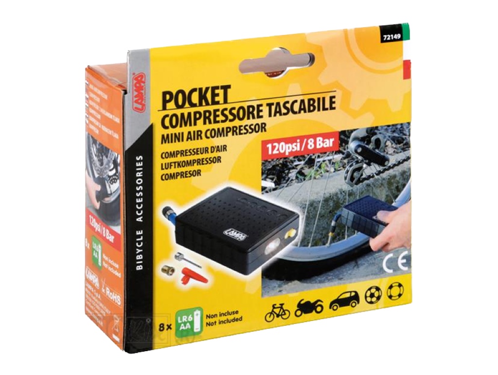 Der Luftkompressor arbeitet batteriebetrieben (8 × AA, nicht im Lieferumfang) und ist damit unabhängig von Steckdose oder Bordspannung. Dank seiner kompakten Abmessungen passt er problemlos in Rucksack, Werkzeugtasche oder unter die Sitzbank.