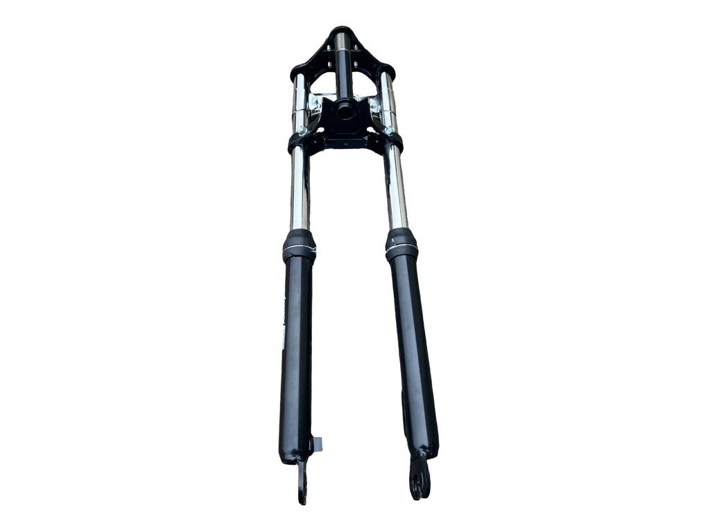 Diese verlängerte Federgabel in Schwarz ist ein hochwertiges Tuning- und Ersatzteil für viele Puch Maxi Mofas. Mit ihrer um 10 cm verlängerten Bauform (Gesamtlänge ca. 700 mm) eignet sie sich perfekt für optische Umbauten, Tieferlegung oder zur Verbesserung der Fahrstabilität.