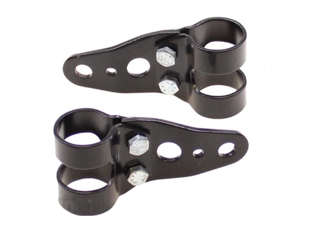 Stabiler Scheinwerferhalter-Satz in schwarz lackierter Ausführung zur Montage am Gabelrohr vieler klassischer Mofas, Mopeds und Kleinkrafträder. Perfekt geeignet für Scheinwerfer mit seitlicher Befestigung.