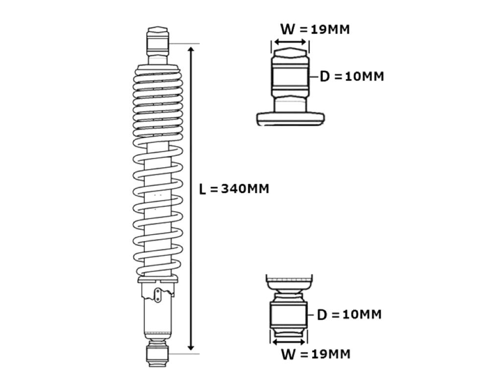Mit 340 mm Länge (Lochmitte zu Lochmitte) und 10 mm Augenaufnahme lassen sich die Federbeine leicht montieren. Besonders geeignet für klassische Modelle wie Zündapp KS 50, Hercules Supra, Simson S51 Enduro, Kreidler RS, Puch Monza sowie Roller wie Peugeot Vogue, Piaggio Bravo oder Yamaha DT 50 MX.