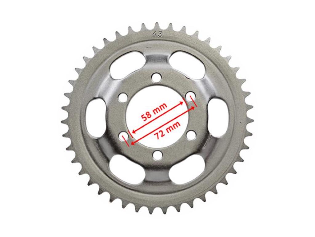 - Kettenrad 43 Zähne (6-Loch, Innendurchmesser Loch: ca. 58mm, Lochabstand Mitte zu. Mitte: ca. 72mm)