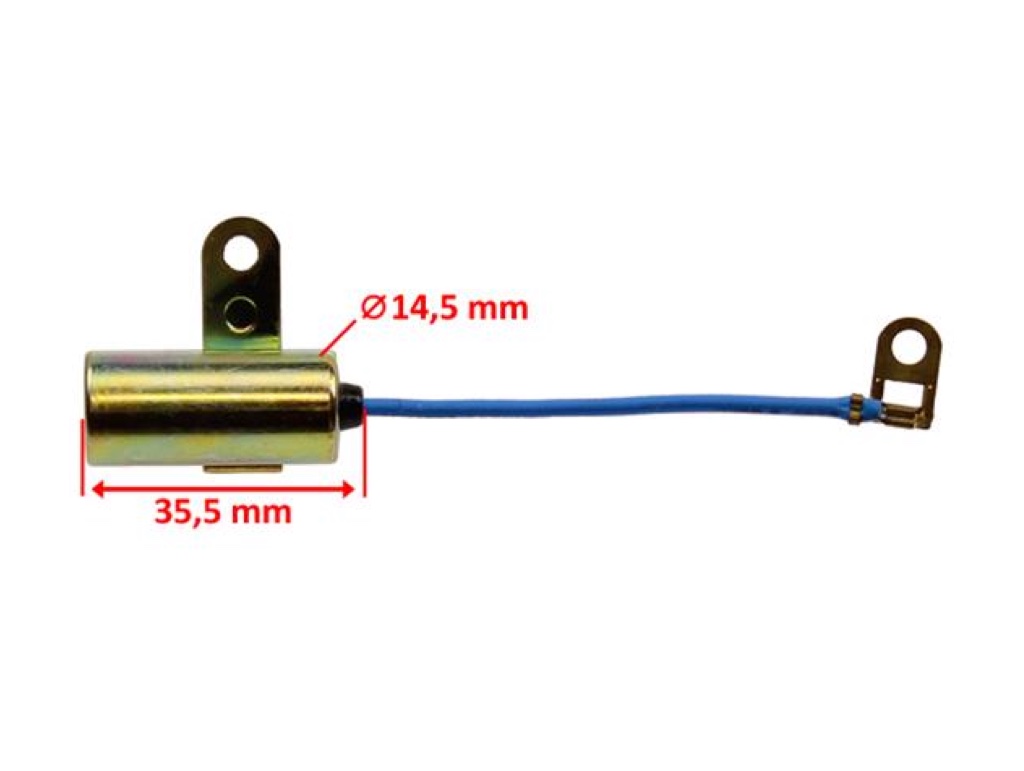 Hinweis: Dieser Kondensator ist ausschließlich für kontaktgesteuerte, sternförmige Zündungen mit den Maßen Ø 14,5 mm x 35,5 mm ausgelegt. Bitte vor Bestellung Maße und Anschlussform prüfen.