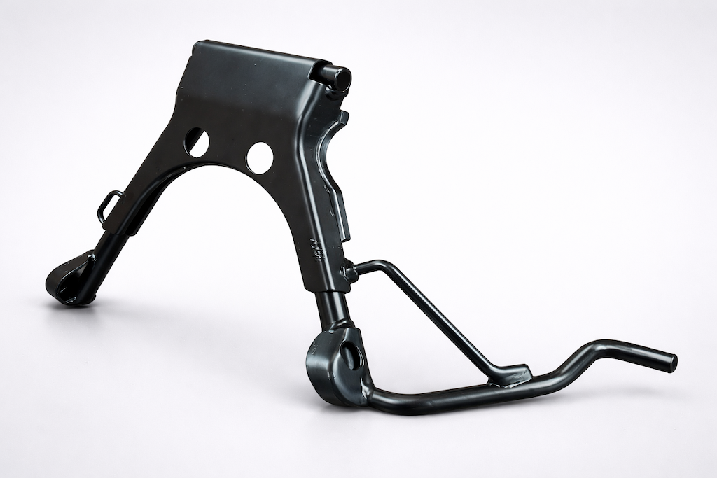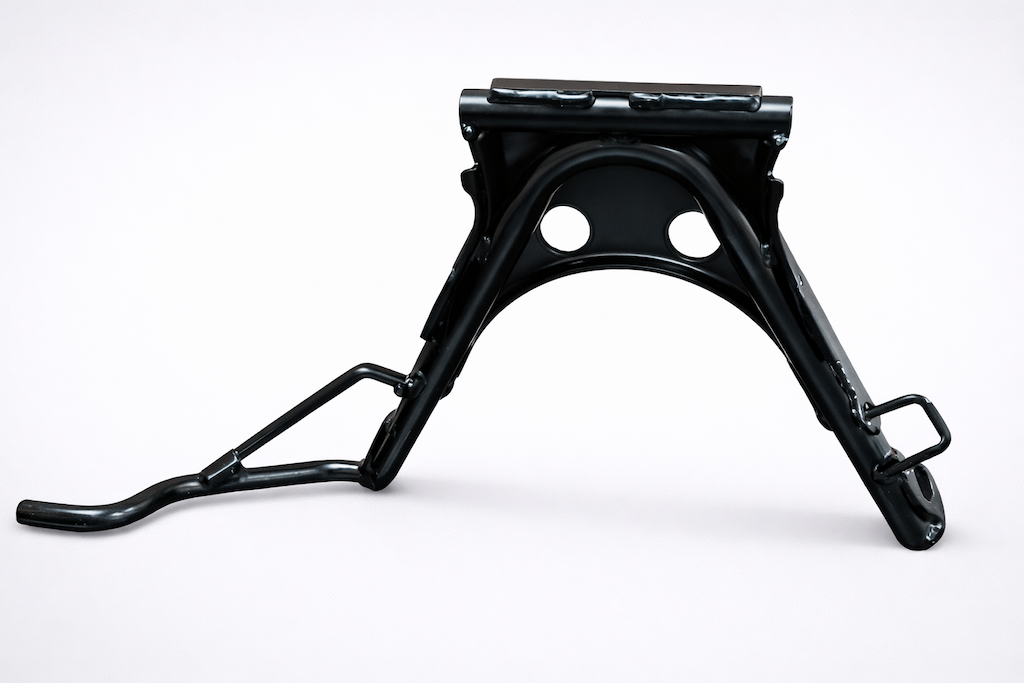 Dank der massiven Stahlkonstruktion sorgt der Hauptständer für sicheres Abstellen des Rollers, auch auf weichem oder unebenem Untergrund. Die schwarze Beschichtung schützt dauerhaft vor Korrosion und Witterungseinflüssen.